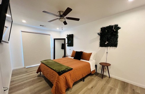 - Master bedroom with a queen bed, private bathroom, and Smart TV.