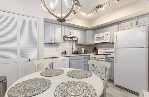 We have tried to make this home as comfortable and nurturing as possible. Vacations are a time to rest and renew. We hope to provide the space for you to deeply relax. Enter the home into a spacious living/dining area that opens to the kitchen. It offers the ideal open floor plan great for hanging out with friends and family. Settle into the comfy sectional sofa and watch a show or movie on the Roku TV. The kitchen is finished with quartz countertops and a glass tile backsplash with a marble style tile floor. The kitchen, panty and liquor cabinet are stocked with all the items needed for great home cooked meals, grilling outside, and making cocktails. Hang out on the pavered patio at the table with an umbrella and grill up some goodies. The front porch is covered and a sweet spot to sit and read a book or enjoy your morning coffee. This home is located on a quiet street across from a preserved woodland so being outside is very peaceful. The neighborhood is great for walking, running and biking.