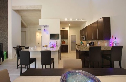 This private fairway condo has a spacious open floor plan with a stunning floor to ceiling fireplace rising up to a 24 ft. high cathedral living room ceiling. The living room hosts modern contemporary furniture, a brand new 75" TV with Dolby sound. (The pic still shows the 60" which was replaced.) The kitchen has all new stainless steel appliances with granite countertops with an additional caesar stone peninsula with a wet bar and bar stools.