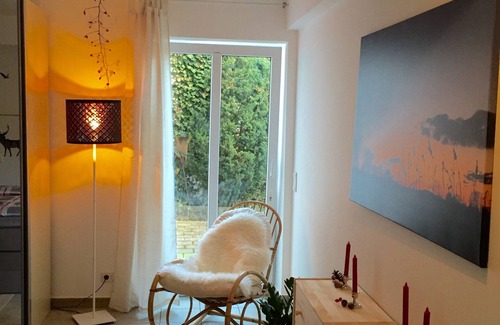 Our apartment is a renovated and completely newly furnished 2-room apartment in a modern Bavarian style. The apartment has a large living-dining room which is open to the kitchen, in the living room there is a TV and free WiFi. The couch can be used as a bed for up to 3 people. In addition, brochures and travel guides for leisure activities as well as books and board games are available to pass the time. In the bedroom there is a box spring double bed and a spacious wardrobe. We can also provide a bed for babies and toddlers, which can also be found in the bedroom. The couch in the living room can be used as a sofa bed for up to 3 people. The apartment also has a large bathroom with shower. There is a terrace in front of the apartment. As a highlight there is also a foosball table in the apartment. Since we do not live in the house, please do not ring the bell at number 15. We will send details of the key handover to our guests before arrival!