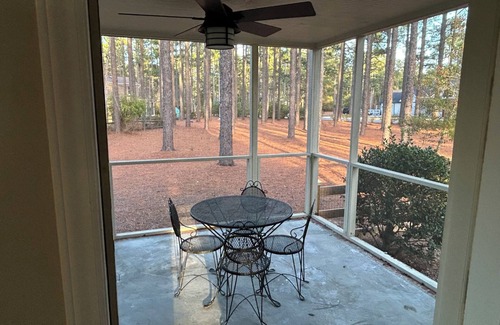 Stay comfortably at this 2-bedroom townhome. Nestled on a peaceful cul-de-sac, this fabulous property features 2 queen beds, 2 bathrooms with showers, and an additional office space with 2 twin beds. Enjoy amenities like a washing machine, AC, WiFi, and more. A pleasant retreat for guests looking for a relaxing getaway. A great place to call homebase while you're away, we hope you enjoy your stay. Property is within 2 miles of Pinehurst #2 and short distance to hospital. Fenced side yard, single car garage and screened porch.