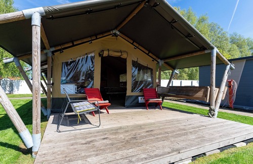 Our safari tent is fully furnished, so you only have to think about your luggage. The tent has two comfortable bedrooms, a fully equipped kitchen and beds made up on arrival. For your convenience, there is a private terrace with furniture, where you can enjoy the outdoors. You can use the shared sanitary facilities of the marina, which are well maintained.