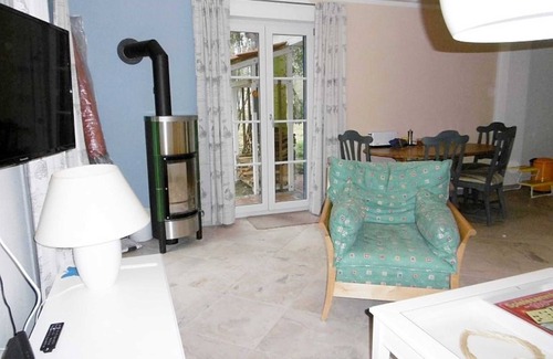 We offer you a 62 square meters apartment in a detached house with a large terrace. Bathroom with shower, tub and toilet and a separate toilet and a guest / WC on the ground. The apartment has 2 bedrooms, one with double bed, one that can be combined with 2 single beds optionally. You have a large kitchen with fitted kitchen (oven, fridge, dishwasher, stove, coffee maker) with a dining table, and a living area with seating area and TV and a fireplace. Bed linen and towels please bring with you.