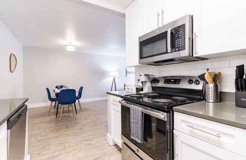 Kitchen: Fully equipped with modern appliances, cookware, Keurig, and essentials for meal prep