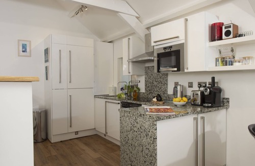 Arrive at your charming abode, stepping into the delightful open-plan living area. Light and spacious, with vaulted ceilings, this characterful space is utterly inviting. The sitting area provides a comfy leather sofa, gas fire and Smart Television, perfect for cosy evenings in. There's a dining table with seating for two guests and a superbly equipped kitchen, providing everything you'll need during your stay, including a Nespresso-style coffee machine and a slow cooker. Pop on the Ruark radio or connect to the bluetooth speaker and listen to your favourite playlist!