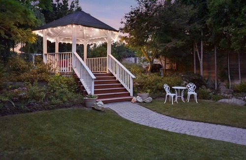 French doors open onto the patio, leading to enchanting gardens with a pond and gazebo, creating an ideal setting for outdoor dining and group activities.