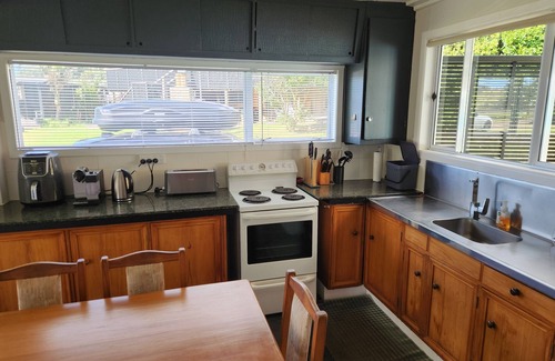 Inside the bach there are new queen beds in both bedrooms, plus a double/single bunk in the larger bedroom. The open plan kitchen/dining/lounge area includes a 5-seater L-shaped couch, 2x armchairs, coffee table and a bookcase with a selection of books, magazines and games. There is a TV with Xbox and games, that also plays the large selection of DVDs.