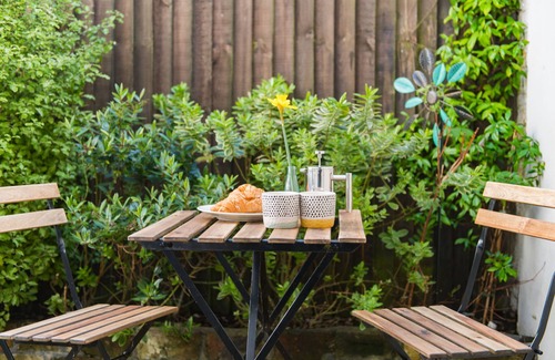 A stable door leads directly from the kitchen to the enclosed courtyard garden, with garden furniture