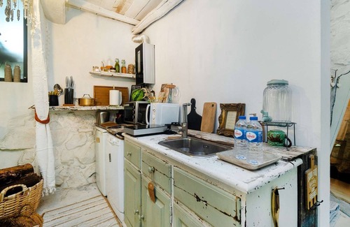 → Fully equipped kitchen with mini fridge, portable electric stove, oven and microwave