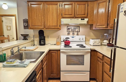 Enter the foyer with a stacked washer/dryer. Through the foyer and to the right is a full bath and straight ahead, a bedroom with two twin beds. To the left, in the center of the condo, is the spacious, open-concept, living, dining, and kitchen areas. The living area offers a 52" flat-screen TV and river sights and sounds. The dining area has AC and seating for six with two additional seats available at the kitchen counter. The deck, with a treed view of the river, is accessed from the living area. On the far side of the living area is the Primary bedroom suite with a king bed, a small television (no cable, bring your own streaming device), AC, and a full, attached bath.