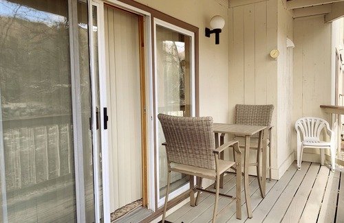 A comfortable first-floor condominium at Riverfront Resort with a wonderful river view. Enter a hall leading to a bedroom with two twin beds and a small television. Just outside the bedroom is a full bathroom. The center of the condominium holds spacious open-concept living, dining, and kitchen areas with plentiful seating and television with DVD. The deck is accessed from the living area and offers a great location to sit and watch the river flow by. The master bedroom is on the far side of the living area and has a queen size bed, television, and private en-suite bath.