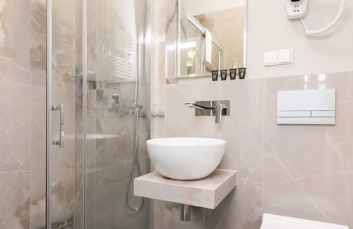 The stylish studio can comfortably accommodate 2 people. The 30m² surface consists of a room with a kitchenette, and a bathroom with a shower. This comfortable space evokes the feeling of staying in a luxury hotel, with stylish decor incorporating a well thought out color scheme. Even in the height of a summer, the studio has optimal temperature thanks to the air-conditioning. The studio is also functionally furnished with a double large bed, a closet and a dining area with a table and chairs. A comprehensive range of amenities, including multimedia (free high-speed WiFi connection and a flat-screen TV) and household appliances (a washing machine, a microwave, a coffee machine, a hair dryer) are a guarantee of a pleasant stay. For a good start of a stay, we provide our guests with complimentary toiletries, towels and bed linens.