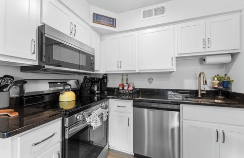 Enjoy cozy evenings by the electric fireplace, or step out onto the grass to walk your pup and take in the peaceful views of Roark Creek. Your mornings start right with a fully stocked coffee bar, complete with a Keurig, drip coffee maker, and complimentary essentials.