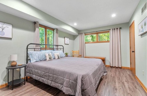 Slip away to this tranquil and spacious lakeside home near Kansas City. Just a one-hour drive from downtown and 25 minutes from Warrensburg you can get away from it all without the long drive you would expect for a beautiful location like it. You canspend quality time with the whole family or a retreat group, Or just escape for a couples weekend.Both kids and adults have plenty of opportunities to choose their own adventures; from fishing and canoeing in the 5-acre lake to exploring the trails that roam through wooded acres and sloping hills. Simply relaxing on the back deck or screened porch to view the diverse wildlife is another perfect way to unwind during your stay.