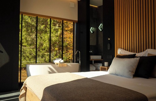 The bedroom offers panoramic mountain views and includes a double bed, two nightstands, soft-glowing light fixtures, and a freestanding bathtub for intimate relaxation.