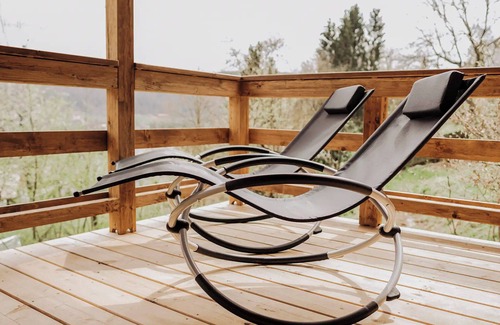 The highlight is your private wellness area: unwind in the warm whirlpool with waterfall feature, enjoy the soothing heat of the barrel sauna, and then rest on the infrared pine loungers. On the covered terrace, you can listen to the gentle murmur of a nearby spring and take in the panoramic valley views – a perfect place to pause and savor the moment.