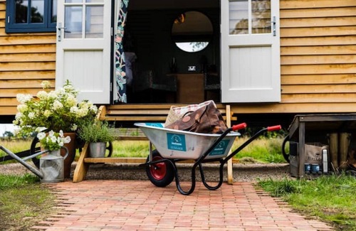 Totally private, unique and romantic escape; the luxury and tranquillity of the bespoke Oak Shepherd's Hut is situated a 5-minute walk to a traditional village pub and a stone's throw away from the Railway walk connecting you to fabulous places to eat and drink. Your indulgent Hotel styled accommodation is nestled into a secluded sunny corner of the Mickleton Countryside where you are surrounded by wonderful views of Teesdale. These can be enjoyed from the hut, hot tub or around the fire pit