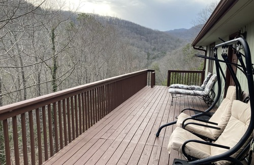 This mountain getaway is close to everything in Asheville, but makes you feel like you're tucked away in a serene secluded spot. The open floor plan has a vaulted ceiling with wood beams and lots of natural light, and features a gorgeous stone fireplace to cozy up to. You have a well-stocked kitchen for nights in, but are also close to numerous excellent restaurants and breweries. The expansive deck has long-range views, but no other houses in sight, and you have quick access to the Blue Ridge Parkway and hiking and biking trails. The master suite has a comfortable king bed to ensure a restful night, and ensuite bathroom with walk in tile and glass shower. This is an established rental on another platform, with over 90 5 star reviews.