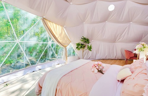 Book a getaway like no other at this geo-dome vacation rental nestled away in Monticello! You’ll be greeted by a serene location and a unique rosé-themed interior. This inviting 1-bath studio provides modern comforts like air conditioning, while still setting a unique glamping experience. Immerse yourself in hiking trails, spend the day at Holiday Mountain Ski and Fun Park, or visit the site of Woodstock 1969. End the day with a grilled meal and memory-making around the fire pit!