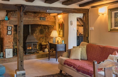 The living space is quirky and heavily beamed with an inglenook fireplace with log burner, a mix of contemporary and antique furnishing. Sofa and chair seating for 4. Smart screen TV. Dining area to seat 4 guests.
