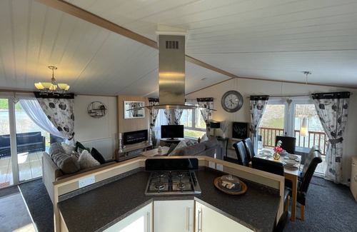 This beautiful lodge is open plan living area with two sofas, large smart tv with games console, dining table with 6 chairs, open plan kitchen area with fully equipped kitchen, full size fridge and freezer with a washing machine and dishwasher, 3 bedrooms, the master bedroom having a king-size bed, the two other twin bedrooms have single beds, two family bathrooms, one en suite to the master bedroom with a large walk in shower, toilet and W.C, the family bathroom is fitted with a bath and over head shower