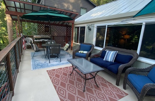 Built into the hillside, a cozy 2 bedroom one bath get away to rest and relax. Well stocked kitchen (condiments and spices to help you execute your meals) with a table that sits 6 easily. Living room opens to a river facing deck with outdoor dining and relaxation options.