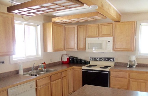 There are 5 beds, but can sleep 9 people since 4 beds are double or queen beds. There is also plenty of floor space for sleeping bags if you bring your own. Inside is a full kitchen with refrigerator/freezer, electric stove, microwave, dishwasher, and center island. Cupboards have cookware, dishes, and eating utensils for 9+ people. In addition to the kitchen, the ground floor has 2 bedrooms (a queen bed in one and a double bed in the other); a full bathroom with tub/shower; a laundry room with washer and dryer; and a living room with wood stove, couch, chairs, and TV/DVD player for playing movies. The upstairs has an open floor plan, with a double bed and a queen bed at opposite sides of the house, a single bed in a curtained nook, a bathroom with sink and toilet, and a front balcony with 2 rocking chairs. The Willow Haus has front and rear decks for enjoying the fresh air. The rear creek-side deck has a propane barbecue and picnic table, and 2 rocking chairs.