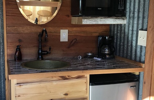 The property has 5 private cabins scattered across 3.25 acres. Four cabins have queen-sized beds and one has a king-sized bed. All cabins have private patios, en suite bathrooms, and kitchenettes with a microwave, refrigerator, and coffee maker in each. Three of these are our award-winning "Eco Cabins", constructed from recycled shipping containers and other reclaimed materials.