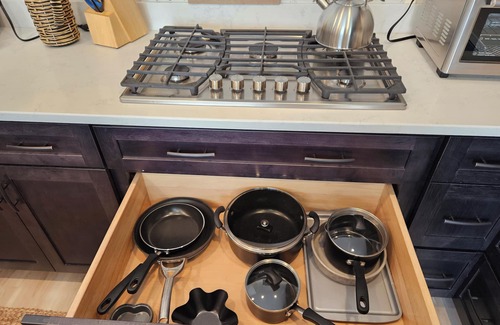 Kitchen with gas cooktop (no full oven), water cooler (hot and cold spring water), toaster oven/air fryer, microwave/air fryer, refrigerator, island with dishwasher, and all new appliances and Quartz countertops. The restaurant next door has good wings, pizza, and seasonal/daily specials.