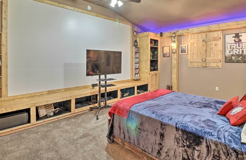 Originally designed as a media room, this well-appointed, western-themed 1-bathroom vacation rental studio cabin features an impressive movie viewing area with a projector, large screen, and audio system, as well as a conventional TV. Enjoy the serene setting this rural area offers while you sit at the outdoor table on the covered patio and take in views of the field and barn across the way. You’ll be 7 miles from Harrison and a little over 30 minutes from Branson, with plenty to do in between!