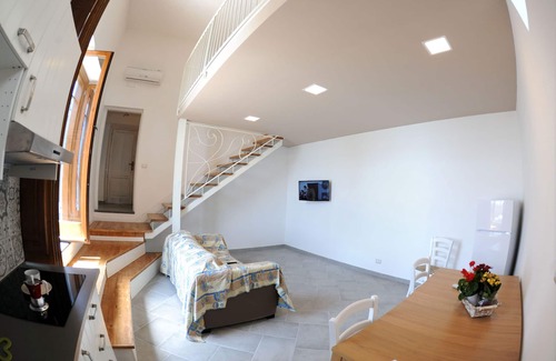 Apartment in villa completely renovated, with large garden equipped with deck chairs and sun loungers for sunbathing, and pergola. The apartment has a large living room with kitchen, sofa bed and TV, sleeping area in the mezzanine with three beds, bathroom with shower and window. The whole house is equipped with air conditioning. We supply strictly clean and bleached white linen.