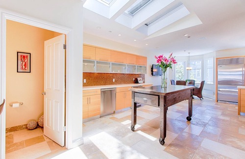 House has lots of natural light from large windows and skylights with an extra large kitchen and entertaining area. Dining room seats 12.