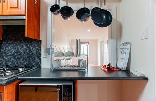 All three bedrooms are well presented for a good night’s sleep. The combination of air-conditioning, heating and ceiling fans keeps things comfortable no matter what season you are travelling in. The first bedroom comes set with a queen-sized bed, while the second bedroom has a double bed and the third bedroom includes a single bunk bed. Refresh within the two bathrooms—featuring a bathtub and shower—and enjoy the convenience of a separate laundry room with a washing machine and dryer.