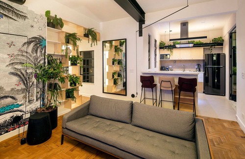 The main terrace transforms into a true urban oasis with its large sofa, a table for enjoying your meals outdoors, and an outdoor shower - ideal for cooling off during São Paulo's hot summers.