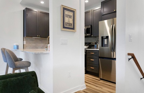 The main floor has the queen bedroom suite, living room, dining room and kitchen. Downstairs there is a private King Master Suite. It boasts it's very own balcony for early morning or late evening quite time, a large updated bathroom, a King bed and a desk for your work needs. There is a porch off of the living room as well as the dining area. There is a grill as well as an outdoor dining table. The living room couch is a sleeper sofa for additional guests.