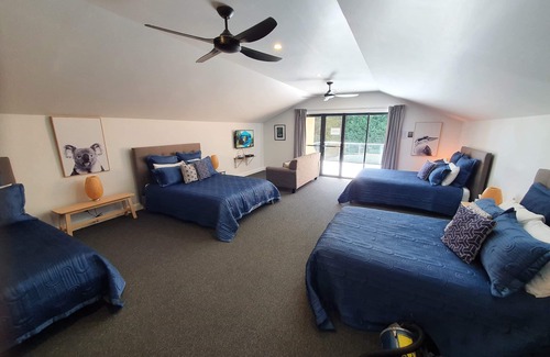 Upstairs is bedroom five with three queen beds and a double bed. The kids will enjoy this retreat with plasma television and Austar.
