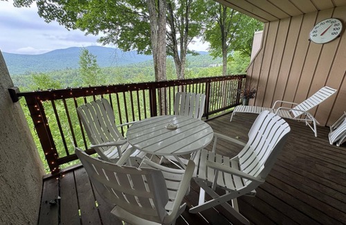 The two comfortable two bedroom condo features one room with 2 sets of bunkbeds with a bathroom, and a second bedroom with a king bed also with a nice bathroom. The kitchen is well stocked for your cooking needs. The living space features a fireplace and a smart TV, as well as a lovely deck with outdoor furniture to take in the spectacular views.