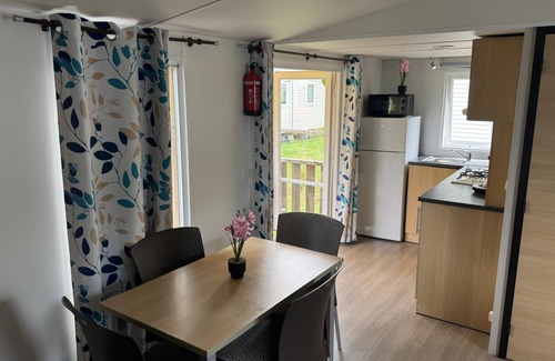 The kitchenette is equipped with a stovetop and a refrigerator, as well as a coffee maker, an electric kettle, and a lobster pot. And you can even pack a bit lighter because there's a washer and dryer. Other amenities include a BBQ grill, heating, and a dining table.