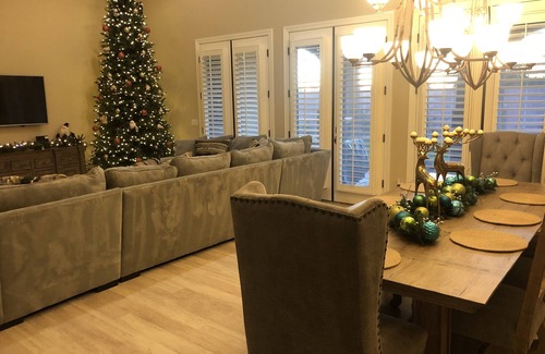 One car garage, master closet & den are not available. 5 bedrooms available, 6 bath, (every room has a private bath), gourmet kitchen, stainless steel appliances, double ovens, all kitchen gadget's, breakfast bar, 2 living area's, 2 fireplace's, huge master, luxury bedding, single level, cul-de-sac, very private, overlooking Mcdowell Mountains, pool, 2 covered patio's, gated (only 20 houses), kid friendly, 1 king bed, 4 queens. One bedroom has a futon as well as a queen bed. Both couches are lounge couches that would accommodate 2 people each. We have 3 blow up mattresses as well. Tuscan inspired, basketball, trampoline, lawn games such as corn hole, bocce ball, ladder game, foosball, huge flat screen t.v.'s, T.v.'s in all bedrooms and rooms of the house, Cox cable, many things to do and in walking distance.... grocery store, restaurants, massage, bank, Starbucks.