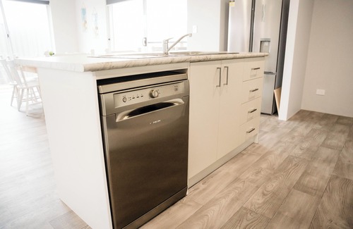 With a focus on families there are toys and activities for the kids and the house is opposite a super size sporting oval across the road, plenty of room for the kids to throw a frisbee or kick a ball. There is also a portable cot with linen and a high chair provided for infants. Manicured parks and play grounds are an only a few minutes walk away. For the Mums and Dads there is a cosy outdoor area with a full gas BBQ and a high bar table with matching bar stools. We even supply a large esky to keep your drinks cold. The home offers a large Smart T.V with an added bonus of a sound bar for your music and there is WiFi to tie it all together, while you sit on the comfy leather chaise lounge suite. The bedrooms offer sliding mirrored robes and drawers for storage and the master bedroom offers a large walk in robe and a well appointed ensuite with a separate toilet. The main bathroom has a deep bath and a separate glass screened shower. Fresh linen and towels are provided for all our guests stay. You’ll be delighted with the well appointed kitchen that offers a 4 burner gas hot plate, overhead range hood and an under bench built in oven. The massive pantry has lots of condiments to make it easy to cook up a storm and tea and coffee is provided. There is a built in microwave and dishwasher as well as an air fryer and all the cooking utensils you need to cook up a storm. The large French fridge offers a roomy freezer and plenty of shelving for your cold food items. The spacious dining area boasts a 6 setting dining suite and there are 3 bar stools at the breakfast bar in the kitchen for snacks. The open space living area also has a large reverse cycle air conditioning system for your comfort all year round. The laundry has a large sliding door linen cupboard, a laundry tub and a combination washer and dryer and there’s a wall hung clothes line outside. There is direct entry from the double garage to the house and your cars are secure with a remote control garage door. The house has fully insulated ceilings and external walls, as well as double glazed windows to the front to ensure a quiet living environment. All this is set in beautifully manicured gardens. This lovely home is truly your home away from home. We look forward to being your hosts!
