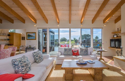 Classic California Beach house! There is an open plan living room with wood burning fireplace and walls of glass. The master bedroom has views of the water and doors to the expansive deck. There is an ensuite bath for master with large tub and separate shower. The kitchen is large and open to the rest of the common space. This is a great place for a family retreat. The beach can be accessed at the Seadrift spit.