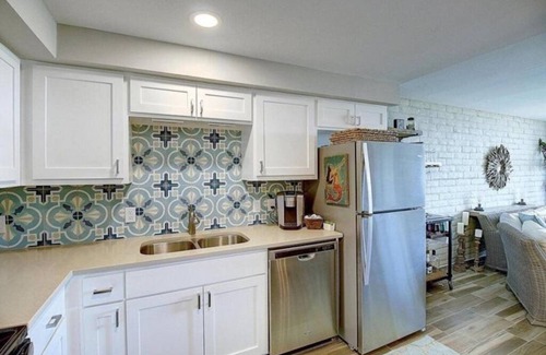The kitchen is updated with Quartz countertops, soft touch cabinets, matching stainless steel appliances, Keurig K cup coffee maker, and amenities of home. There is a bar setup station with a Margaritaville blender for your use during your stay. Off the kitchen is a farmhouse table with dining for six.