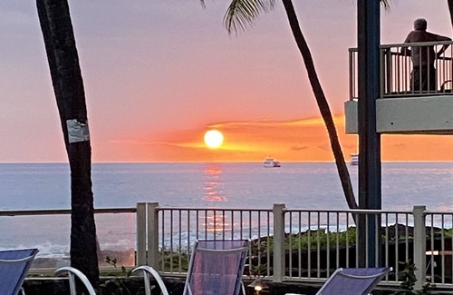 Oceanfront, Surfside, top floor, corner, one bedroom condo for two with gorgeous ocean views and access to sandy Honl's Beach(popular sunbathing, surfing spot immediately next to Kona Reef Resort). Feel the ocean breezes with our extra side windows and extra privacy. New Split/AC cools Living and Bedroom areas. Within walking distance (1/4 - 1 mile) of trendy, Historic Kailua Village and downtown Kailua-Kona with many coffeeshops, restaurants, Hawaiian vendors, breweries. churches, farmers market and attractions. Several tropical tourist attractions on incredibly diverse Big Island, Hawaii. A wonderful tropical paradise vacation awaits you at Kona Reef. Welcome to the Big Island, Hawaii, land of Aloha and dreams!