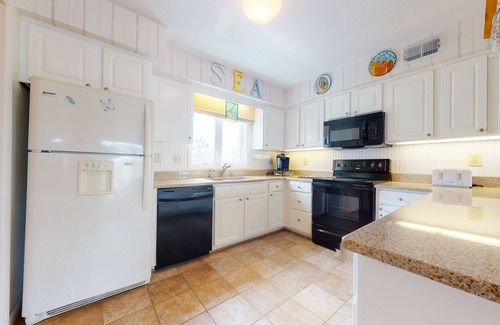 Ascend a flight of stairs to reach the main living space on the second floor, where you'll be greeted by an open kitchen with a breakfast bar, a circular dining table, and an oceanfront living room with a sectional sofa and a large flatscreen TV. Central AC, high-speed WiFi, and a washer/dryer are all on hand as well. The two bedrooms - including an oceanfront primary suite with its own TV and bathroom - are on the third floor and an additional sleeping loft is on the fourth level.