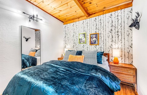 Inside the home, an open layout makes it easy for your group to unwind together. Start your day with morning coffee at the kitchen bar. Indulge your inner chef in the kitchen, then share meals at the four-person table that overlooks forested views. After dinner, cozy up on the sectional in the living area and stream a movie on the smart TV. A desk with a chair offers guests a convenient work-from-home space.
