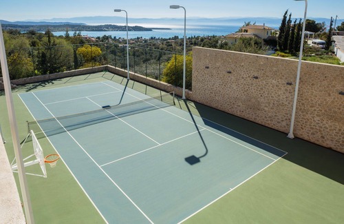It is located on a hill with a full view of the sea and picturesque sunsets. It is close to a network of islands such as Spetses, Hydra, and Poros that can be accessed from nearby ports.The villa has 5 bedrooms each with a bathroom. It also has a swimming pool, a professional tennis court with a basketball unit, two parking areas for 6 cars, a barbeque and two gardens with a waterfall.