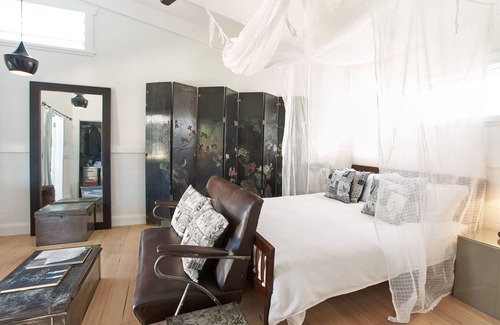 Private studio cottage nestled within the tranquil gardens of a renovated Federation home, built in 1925. Large stylish bedroom and living area furnish with an eclectic mix of 20th century furniture and an expansive deck designed for outdoor dining and chilling.