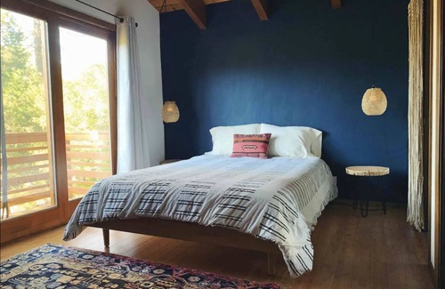 This is a two bedroom, two bathroom home with a loft that can accommodate up to 6 guests. The main living area has 30ft ceilings and is filled with various musical instruments including a violin, guitars, a mandolin, piano and ukulele. Great for a creative retreat!
