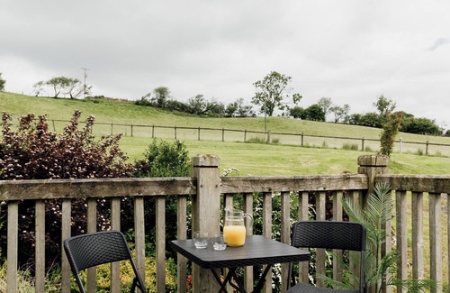 Sleeping 5. Barcud is a luxurious retreat offering a tranquil escape with breathtaking rural views of meadows, often home to squirrels and red kites. Designed with comfort in mind, the open-plan living, dining, and kitchen area features high vaulted ceilings, beautiful beams, and modern amenities like an electric hob/oven range, microwave, fridge, freezer, dishwasher, and washer/dryer. The cozy living area invites relaxation with plush sofas and chairs, while the private balcony adds a peaceful touch. Situated on a private 13-acre estate, it’s perfect for families, friends, and even pets, with walking paths and a shared hot tub for added enjoyment.