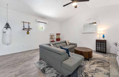 The main level has 5 bedrooms -with a total of 10 beds (four of which are bunk beds)- and 3.5 bathrooms. One of these bedrooms has a king size bed, murphy bed and a full bath with a bathtub. Also on this floor is a beautiful stocked kitchen with an island and dining table perfect for entertaining large groups.